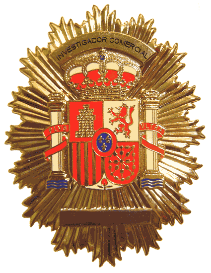 The plate of INVESTIGATOR COMMERCIAL used in Spain, is oval and bathed in gold. The base rafagada or base of lightning, represents the authority and power. In its top, leads a window with the inscription "INVESTIGATOR COMMERCIAL". In the bottom, leads a window where you are going recorded the number professional expert. In the center, leads the shield Constitutional of Spain, enamelled in red, white and blue. On the same, a crown, which represents the Parliamentary Monarchy of the Kingdom of Spain.